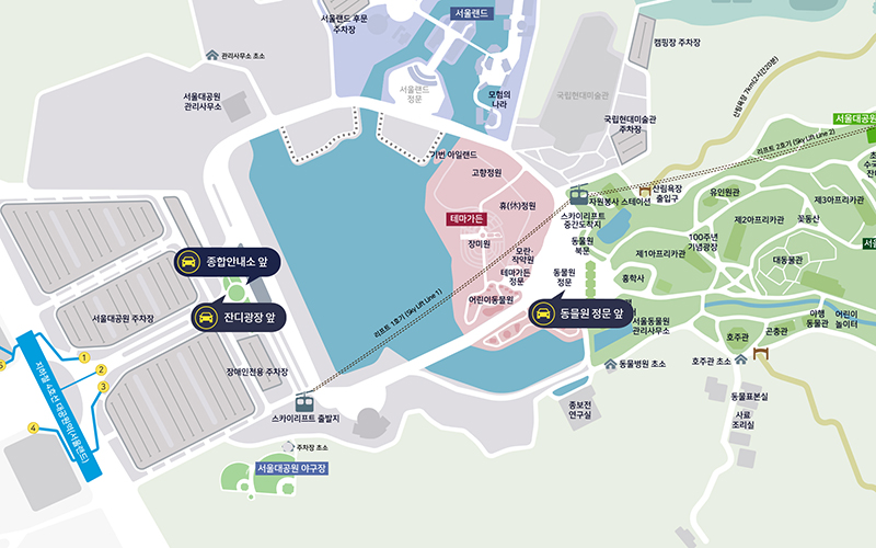 - 동물원 정문 앞 2대, 종합안내소 앞 4대, 만남의광장 앞 4대